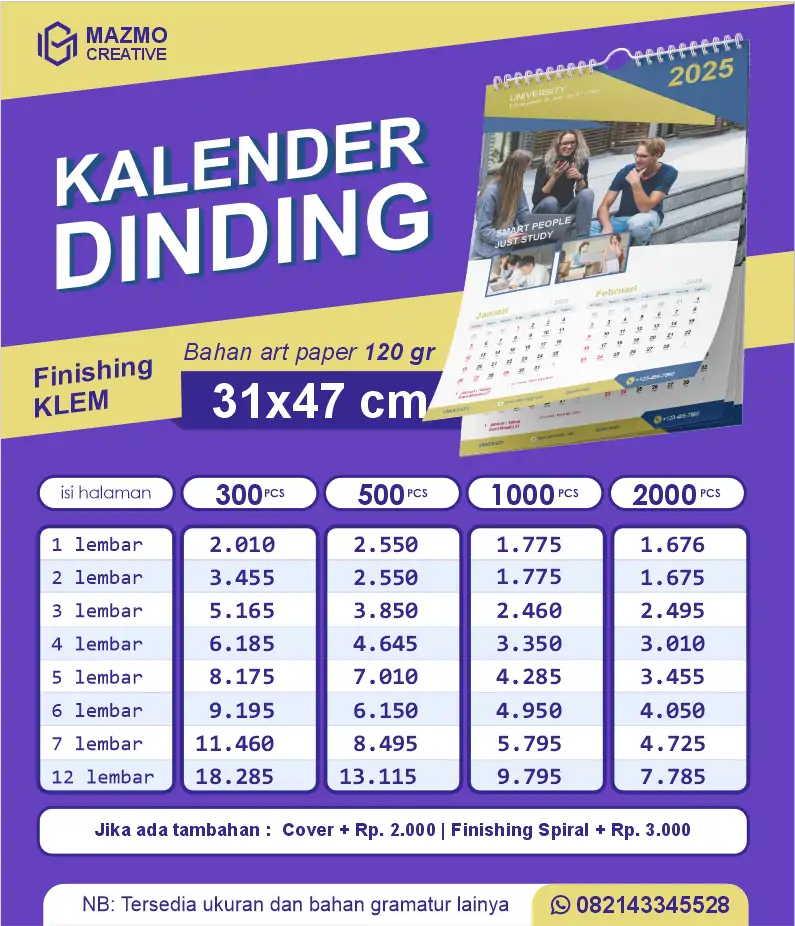 - Kalender Dinding Kalender dinding merupakan salah satu yang paling umum. Ukurannya yang besar memungkinkan lebih banyak ruang untuk desain, gambar, dan informasi bisnis Anda. Dalam konteks percetakan kalender dinding meja murah 2025, kalender dinding sering kali dipilih oleh bisnis karena efek visualnya yang lebih besar.